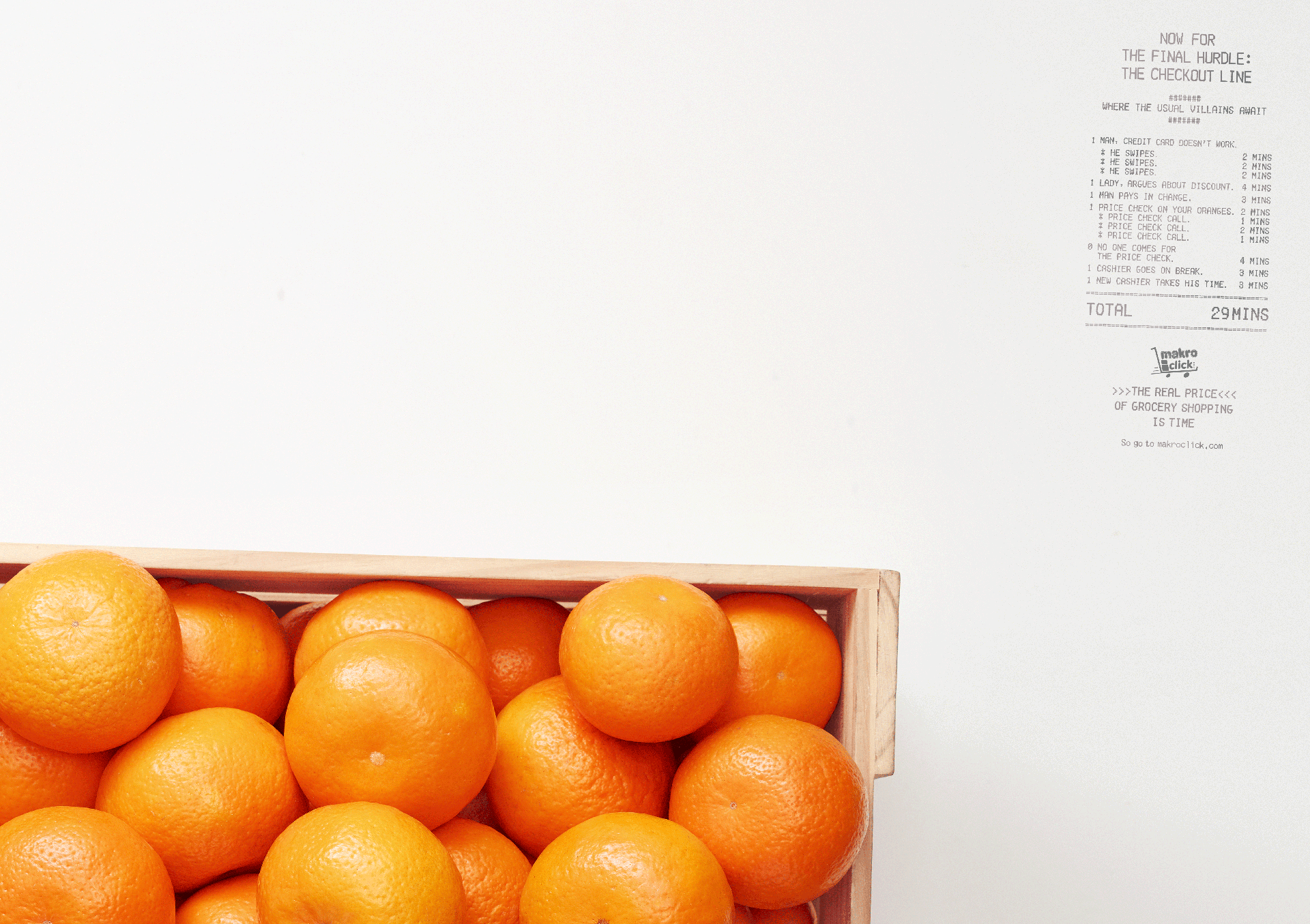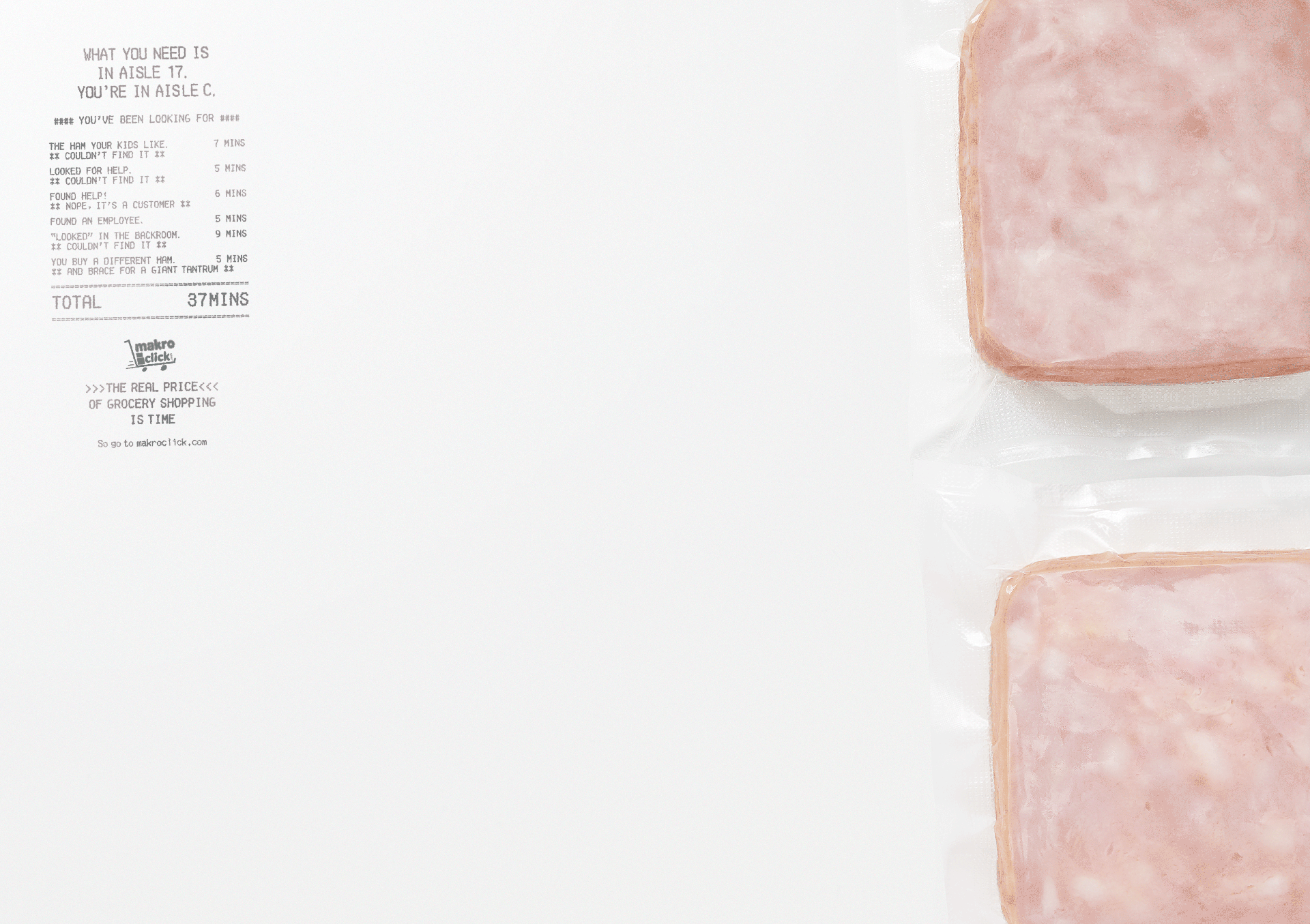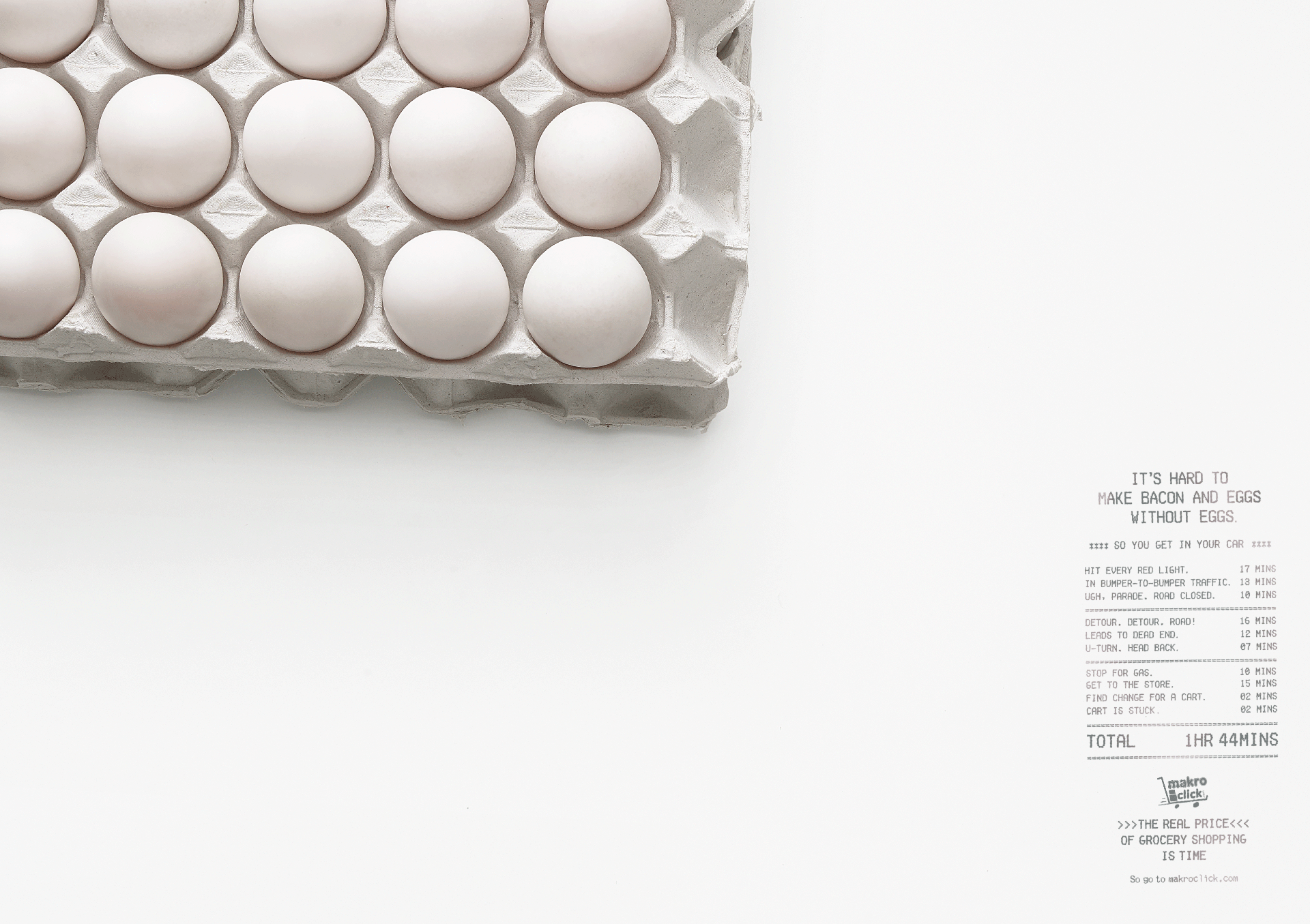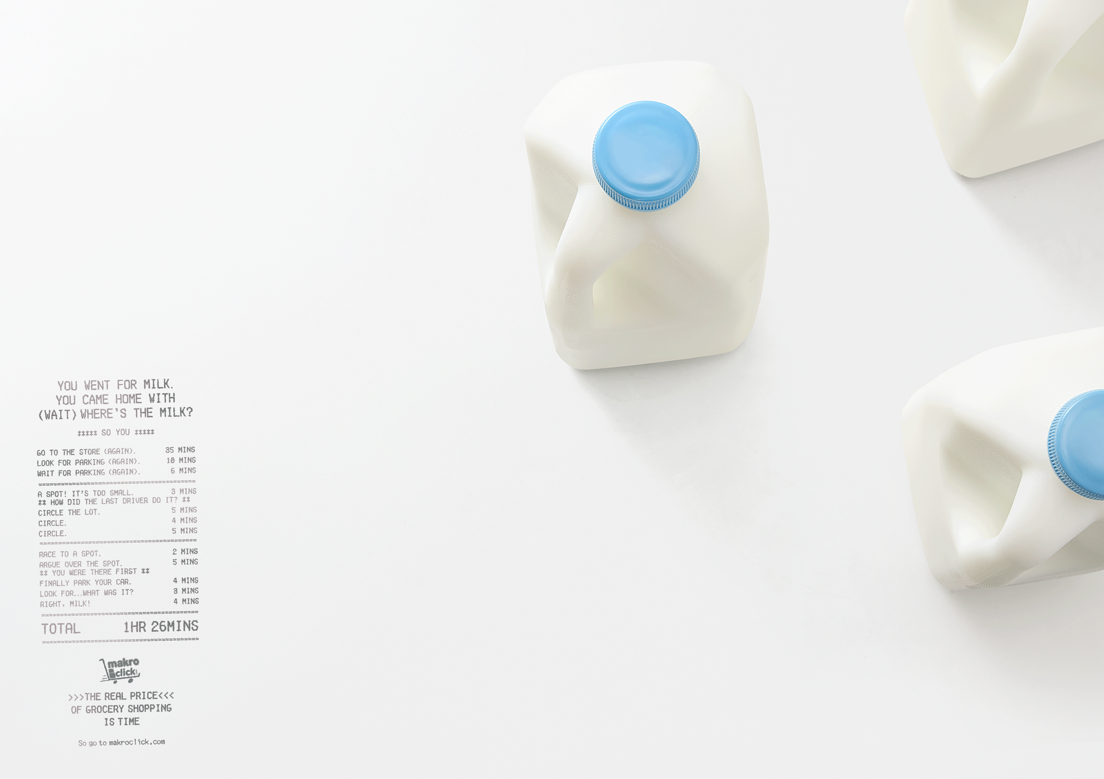 Makro, the international chain of bulk-supermarket stores, wanted more people in Thailand to use their online service, Makro Click, and have their groceries delivered home. But shoppers in Thailand don’t usually order their groceries on the internet, preferring to drive to their local supermarkets, and ending up in countless traffic jams. So we created a poster and print campaign that showed people the real price of going grocery shopping - their precious time.